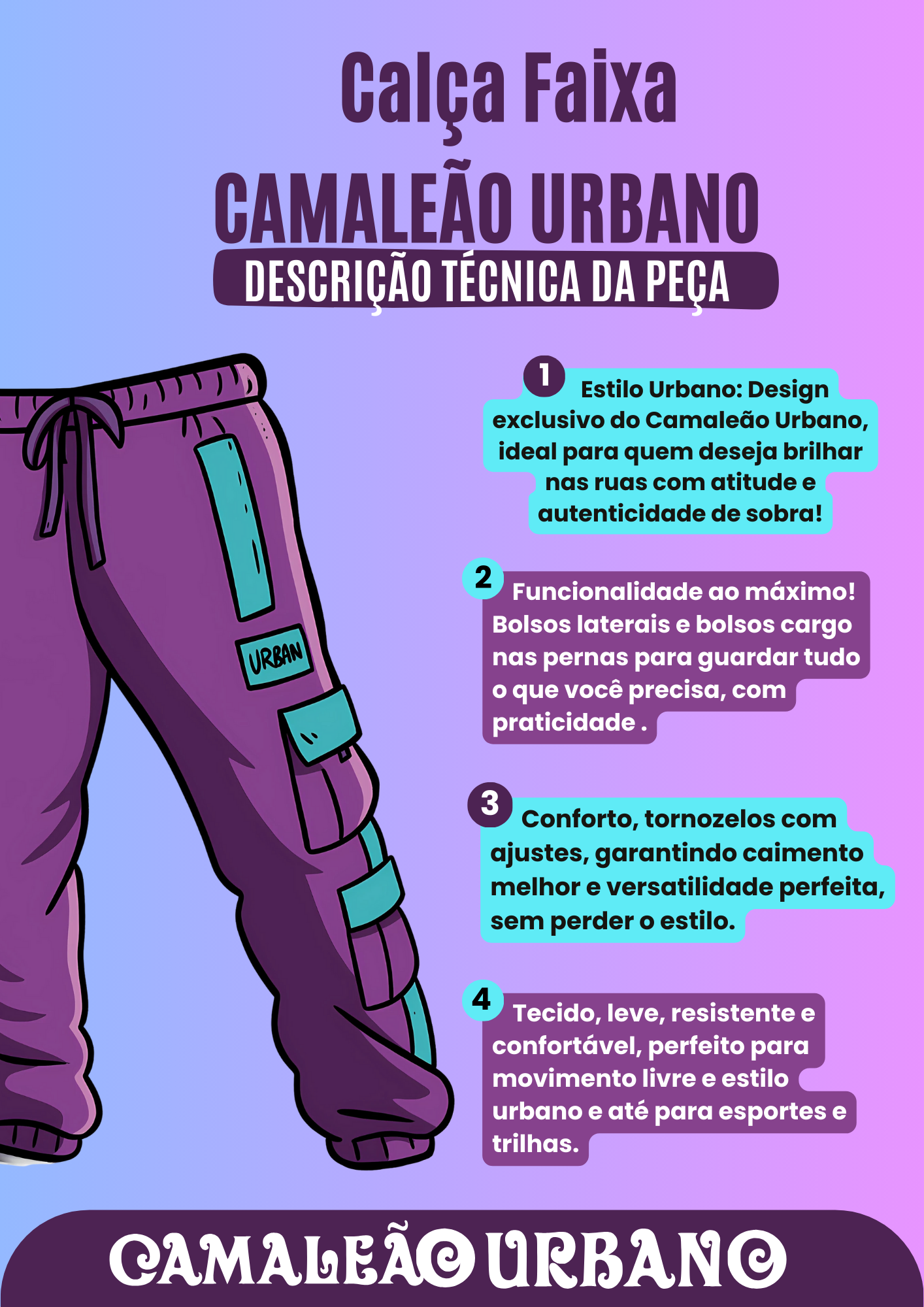 A Calça Jogger Tactel Faixa Camaleão Urbano foi criada para quem busca conforto, praticidade e estilo. Com design exclusivo e recortes inspirados em referências orientais, ela combina streetwear e sportswear de forma única.